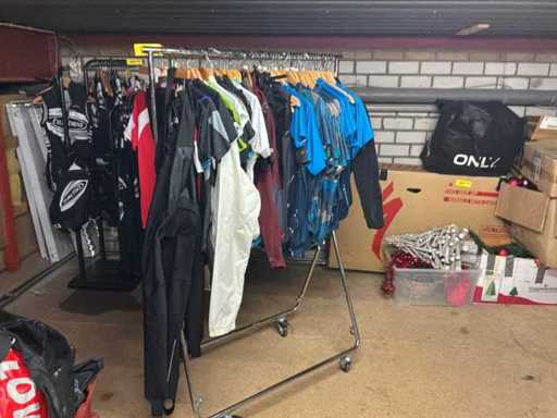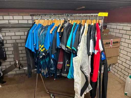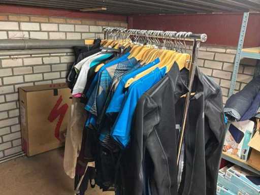 Vari marchi di abbigliamento per ciclismo. Un mix di abbigliamento da donna e da uomo. Dimensioni e tipi diversi. Include il portapacchiere.