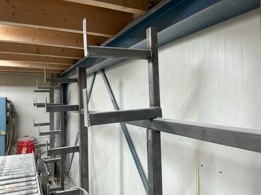 Vari tubi, tubi e profili angolari in varie lunghezze; con 2x cremagliera a sbalzo; 1x cremagliera a sbalzo 550x63x215cm; 1x cremagliera a sbalzo 280x63x215cm