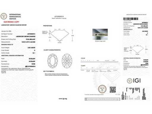 Questo bellissimo anello solitario in oro da 18 carati ha un diamante ovale coltivato in laboratorio di 2,02 carati. Il diamante ha un brillante colore D e una splendida nitidezza VS1. Il diamante coltivato in laboratorio che è incastonato nell'anello ha e viene fornito con un certificato ufficiale IGI che ne conferma la qualità. La taglia dell'anello è 54 e può essere modificata gratuitamente a tuo piacimento, si prega di contattare troostwijk telefonicamente o via email, che ti metterà in contatto con noi.