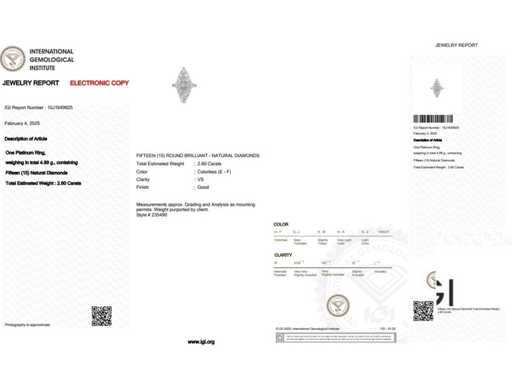 Anello Luxury Design Diamante Naturale 2,60 carati in platino 4,89 gr. con 15 diamanti rotondi naturali brillanti 2,60 carati. Colore superiore e purezza E-F / VS. Certificato da IGI Laboratoire, uno dei più grandi istituti internazionali per la certificazione e la valutazione di diamanti e pietre preziose. Per ulteriori informazioni, consulta il certificato. Il vero gioiello è meglio delle foto. Stima del prezzo del rivenditore: 12'950.- Nuovo gioiello.