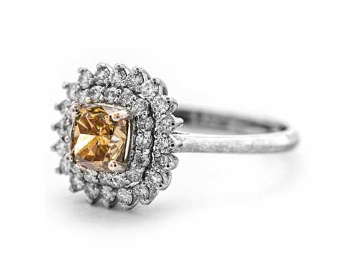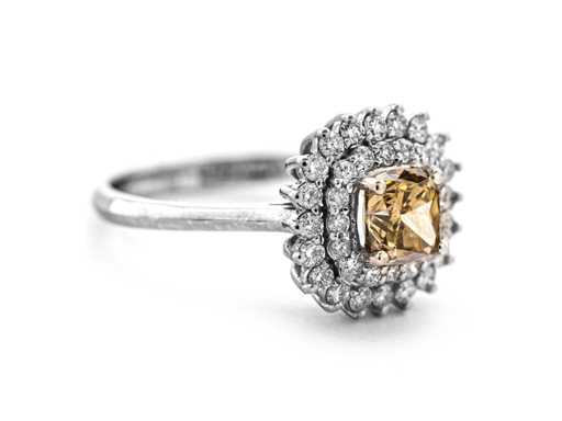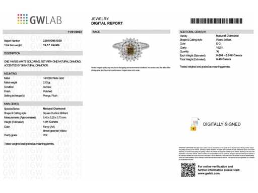 Anello di lusso Diamand Naturale Marrone Fantasia Verde Verde Giallo 1,50 carati in oro bianco 14k, peso totale 2,93 gr., con diamante Naturale Marrone Fantasioso Verde Giallastro 1,01 carate in forma brillante a cuscinetto quadrato, ottima nitidezza VS2 e 36 diamanti brillanti rotondi di 0,49 carati. Le foto vengono fatte senza lucidatura subito dopo la produzione, per vedere solo la qualità della pietra. Le foto sono state scattate subito dopo la produzione, prima della lucidatura. Attualmente, l'anello ha una splendida rifinitura. I diamanti colorati di lusso rappresentano meno del 2% della produzione totale di diamanti, rendendoli uno dei minerali più rari e preziosi al mondo. Certificato da GWLAB Laboratoire, uno dei principali istituti indipendenti al mondo per la certificazione e la classificazione delle gemme. Per maggiori informazioni consulta il certificato. I veri gioielli sono migliori delle immagini. Prezzo stimato al rivenditore: € 13.950.-