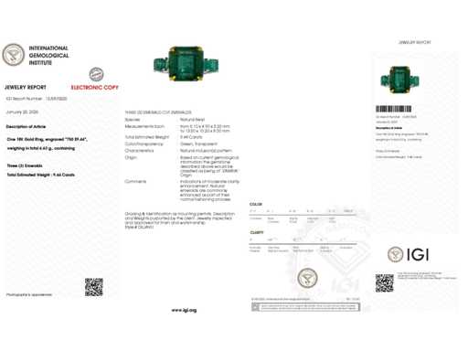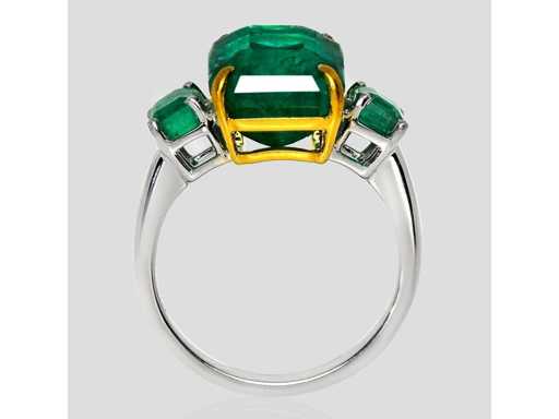 Anello di lusso in smeraldo verde Zambia naturale 9,44 carati in oro bianco e giallo 18k, peso totale 6,63 gr. Pietra centrale: 3 smeraldi naturali di Zambia green in smeraldo tagliati 9,44 carati. Certificato dall'IGI Labaratoire, uno dei più grandi istituti indipendenti al mondo per la certificazione e valutazione delle pietre preziose. Per maggiori informazioni, vedi il certificato. I gioielli in realtà sono migliori delle foto. Prezzo stimato al dettaglio: € 48.850.-