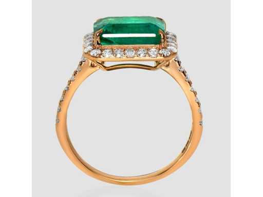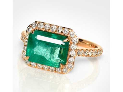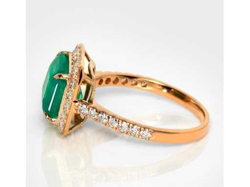 Anello di lusso in Zambia Green Emerald naturale 3,42 carati in oro rosa 14k, peso totale 2,82 gr. La pietra centrale è uno smeraldo verde Zambia naturale in smeraldo tagliato 2,90 carati con 38 diamanti brillanti rotondi da 0,52 carati. Certificato dall'IGI Labaratoire, uno dei più grandi istituti indipendenti al mondo per la certificazione e valutazione delle pietre preziose. Per maggiori informazioni, vedi il certificato. I gioielli in realtà sono migliori delle foto. Prezzo stimato al dettaglio: € 13.950. - Gioielli nuovi.