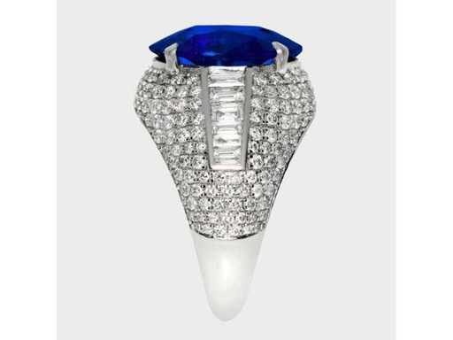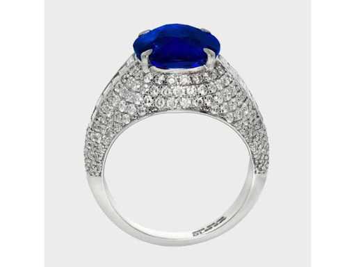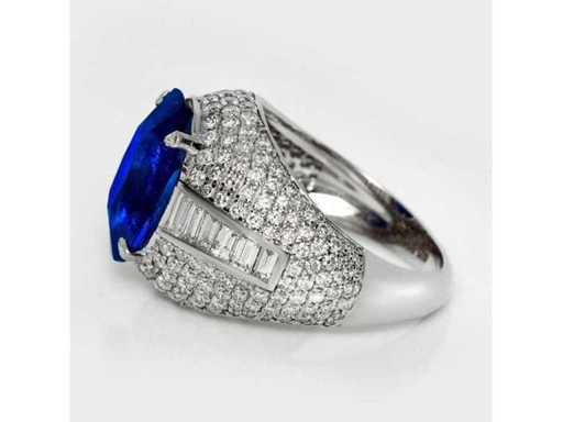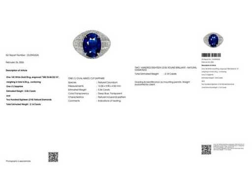 Anello di lusso per gioielli alti in zaffiro blu profondo naturale 7,20 carati in oro bianco 14k, peso totale 6,04 gr. con forma ovale in zaffiro blu profondo naturale 5,06 carati e 218 diamanti brillanti rotondi da 2,14 carati. Certificato da IGI Labaratoire, uno dei più grandi istituti indipendenti al mondo per la certificazione e la valutazione di pietre preziose. Per maggiori informazioni consulta il certificato. I gioielli in realtà sono migliori delle foto. Prezzo stimato al dettaglio: € 33.950.-