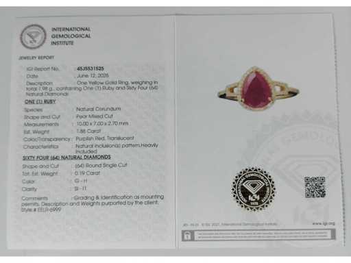 Anello in oro giallo 14 carati con 2.07 ct Diamante rubino.