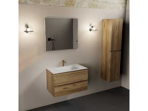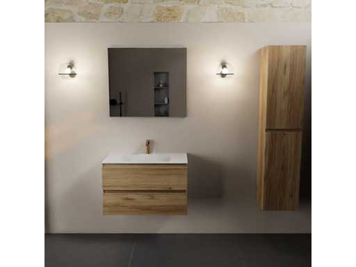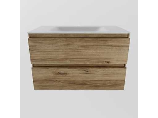 Armadio da bagno con lavabo a superficie solida (pietra artificiale) 80cm, con foro del rubinetto, 2 cassetti, mobile superiore in quercia
