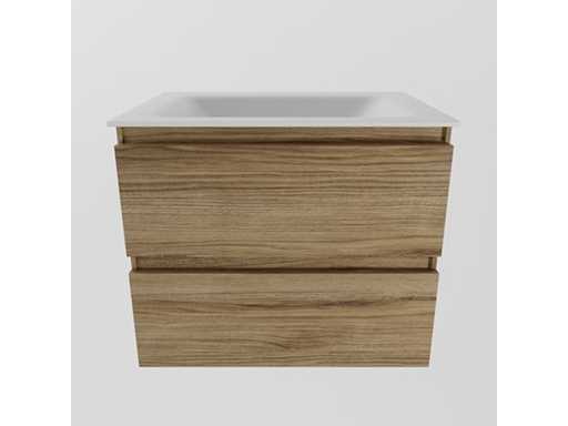 Armadio da bagno con lavandino a superficie solida (pietra artificiale) 60 cm, senza foro di rubinetto, 2 cassetti, mobile superiore in quercia