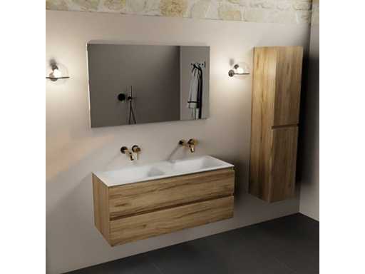 Armadio bagno con lavandino a superficie solida (pietra artificiale) 120cm, senza foro di rubinetto, 2 cassetti, mobile superiore in quercia, posizione lavandino: doppio