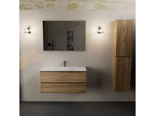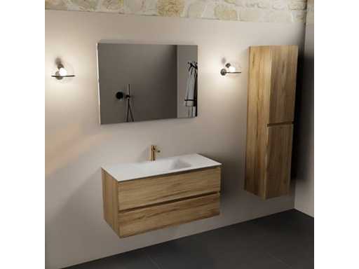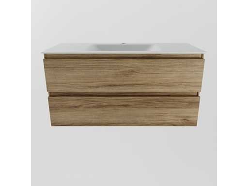 Armadio da bagno con lavandino a superficie solida (pietra artificiale) 100cm, con foro del rubinetto, 2 cassetti, mobile superiore in quercia