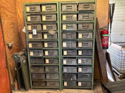 Inclusi: 5x cassa in metallo, 540x800x2130mm, con 20 contenitori metallici. Il contenuto di questi contenitori (materiale di montaggio) è incluso nel lotto. Le foto del contenuto dei contenitori sono a scopo illustrativo. 3 armadi non hanno contenuti, solo contenitori vuoti.