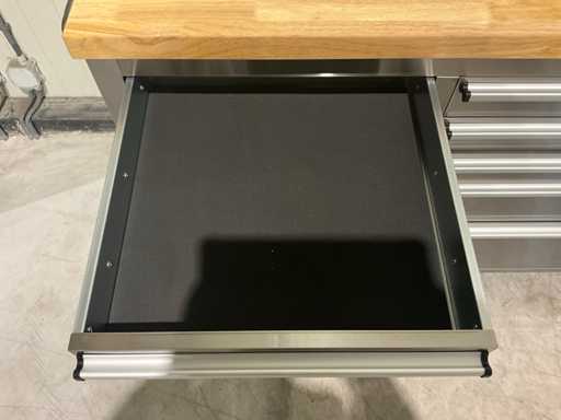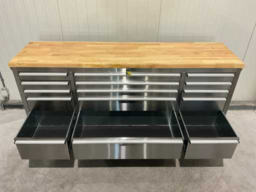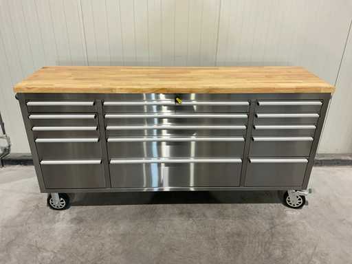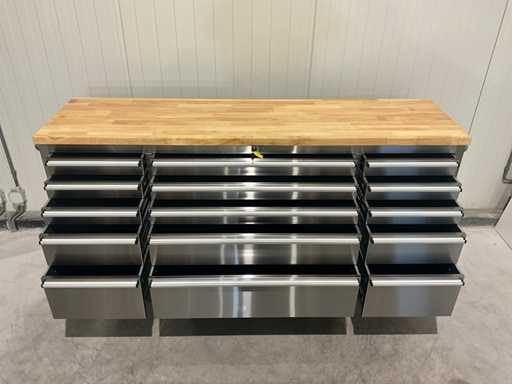 Equipaggiata con tutto il 430 acciaio inox anti-impronte; 15 cassetti; piano da lavoro in legno da 35 mm; 2 maniglie; 4 ruote da 6 pollici di cui 2 ruote con freno; chiudibile con una chiave; Inutilizzato in scatola (dimensioni di trasporto 190x55x90 cm)