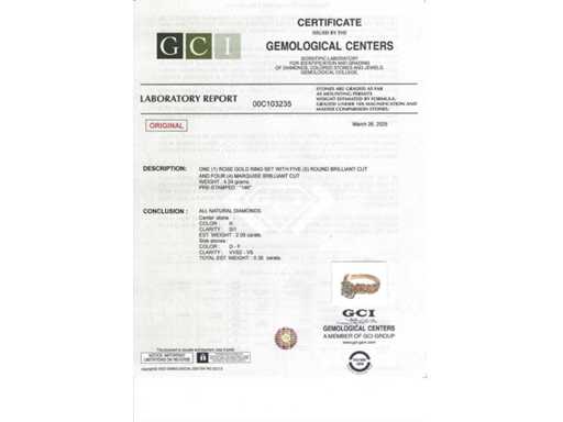 Anello di lusso splendido Diamante Naturale 2,43 carati in oro rosa 14k, peso totale 4,24 gr., con un grande diamante naturale rotondo taglio brillante H/SI1 da 2,08 carati con 4 pietre marquise diamanti naturali brillanti, qualità D-E-F / VSS2 - VS di 0,35 carati. Certificato da IGI Laboratoire, uno dei più grandi istituti internazionali di certificazione e valutazione per diamanti e pietre preziose. Per maggiori informazioni, vedi il certificato. I gioielli in realtà sono migliori delle foto. Prezzo stimato dal rivenditore: 45.850.- New Jewel.