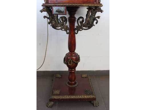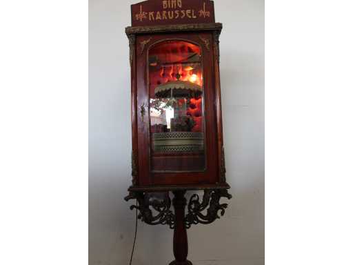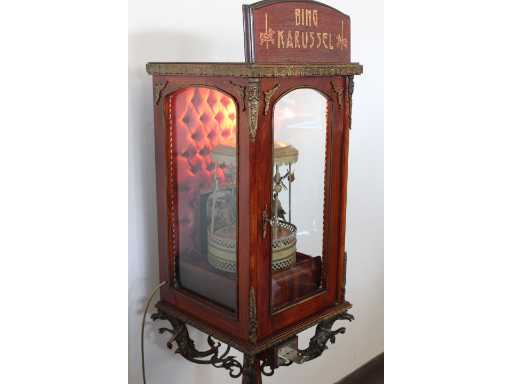 Giostra rotante in latta (1911) in vetrina su gamba decorativa, con inserzione moneta da 0,25 centesimi, ruota con musica da luna park