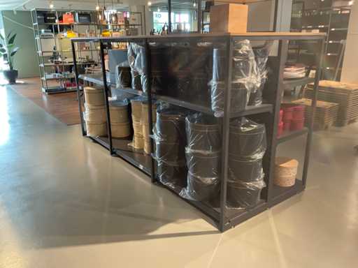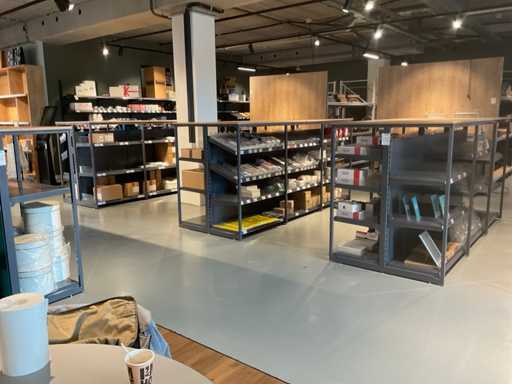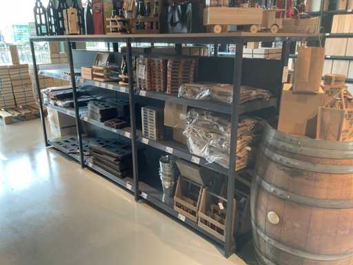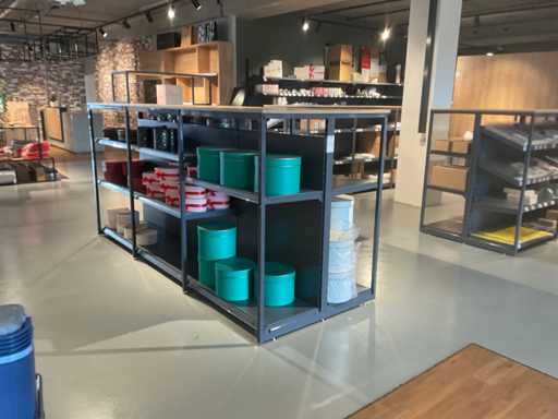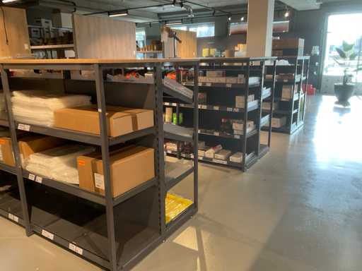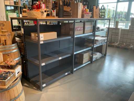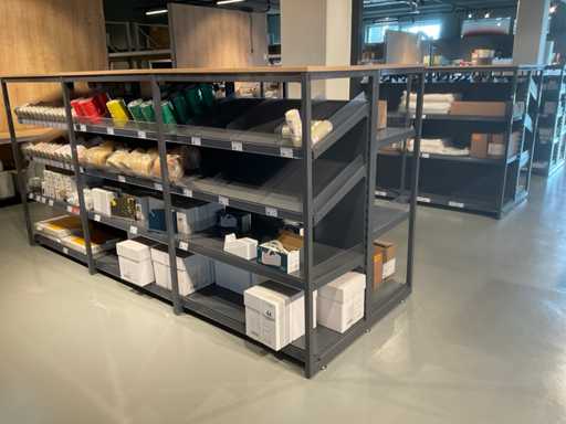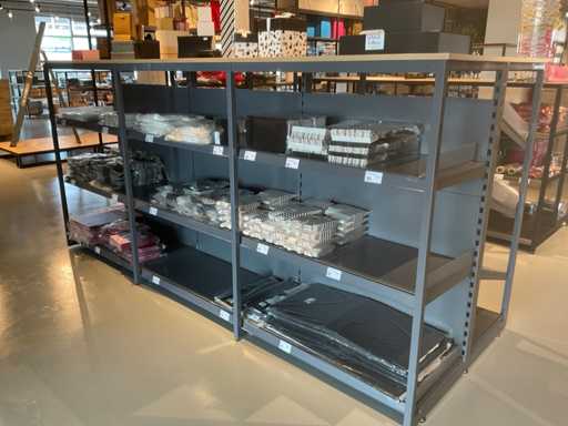 7 pezzi di scaffale doppio composto da (ciascuno) 4 montanti di circa 112x142x3 cm, circa 135 ripiani e pareti posteriori, compresi gli accessori come portacartellini dei prezzi, divisori ecc.
