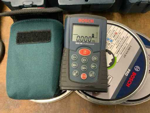 Vari utensili Bosch, tra cui trapano, smerlatrice, seghetto alternativo, fodera laser, telemetro laser e dischi abrasivi