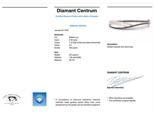 neri Diamante: Naturale; Taglio: Taglio brillante; Peso (carati): 2,00 carati; Colore: Bianco alto (F-G) e nero (potenziato); Purezza: USA; Qualità del taglio: Molto buona; Gioiello: Braccialetto; Peso: 20,5 once; Dimensioni/lunghezza: 60 mm; Materiale: 14 carati (585); Condizione: Nuova; Imballaggio: scatola di gioielli di lusso; Spiegazione: La qualità è stata presa dal rapporto relativo all'articolo. La valutazione è una valutazione di un commerciante certificato di diamanti, basata sui prezzi al consumatore; Prezzo al consumo: € 12.600
