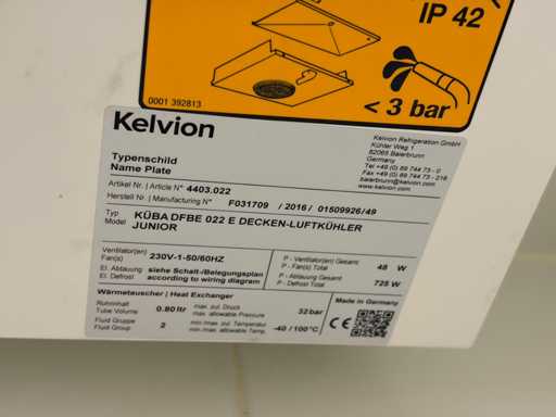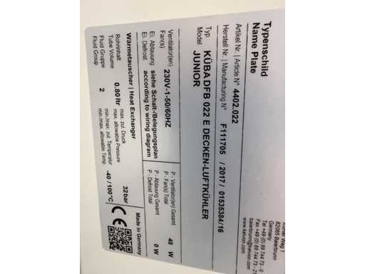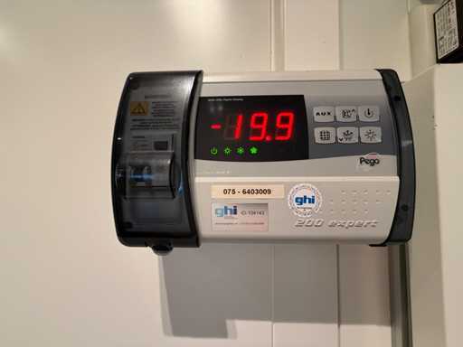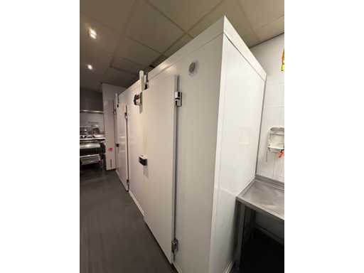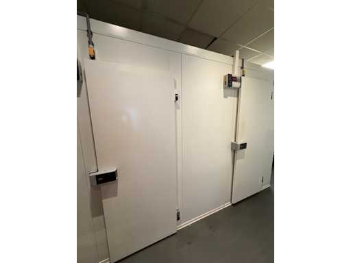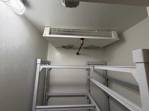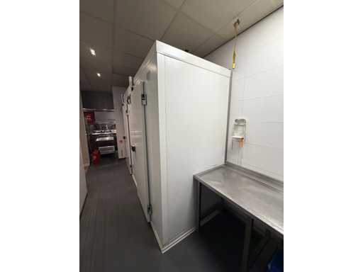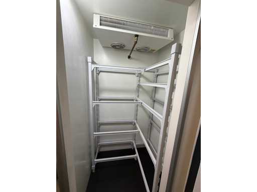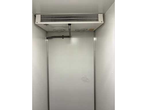 Dotato di evaporatore Kelvion Küba DFB 022 Junior (camera frigorifera) e evaporatore Kelvion Küba DFBE 022 Junior (stanza congelazione). Dimensioni: camera fredda approssimativa. L240 x W120 x H240 cm e dimensione della cella del congelatore approssimativa. L140 x W120 x H240 cm. Include il portamensole Cambro.
