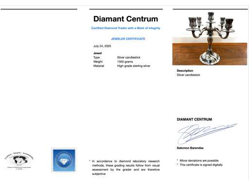 Il valore al dettaglio indicato con gioielli e diamanti è il prezzo storico al dettaglio. Questo è il prezzo a cui i gioielli sono stati/sono nella vetrina del gioielliere in passato o in alcuni casi lo sono ancora. La valutazione è una valutazione effettuata da un commerciante di diamanti certificato e membro della Beurs voor den Diamanthandel ad Amsterdam.