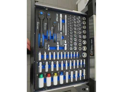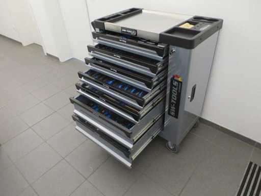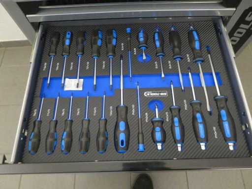 Carrello degli attrezzi di alta qualità con 8 cassetti a cuscinetti a sfera, di cui 6 completamente dotati di attrezzi. Il carrello è chiudibile a chiave e dotato di 4 ruote robuste (2 sterzabili, 2 bloccabili) per un lavoro confortevole e sicuro. Un robusto piano di lavoro in polipropilene completa l'attrezzatura.