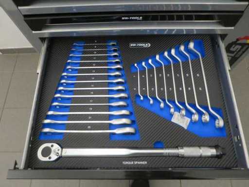 Kit di chiavi a estremità aperta/cricchetto (circa 8–22 mm), set di chiave a doppio anello e chiave dinamometrica.