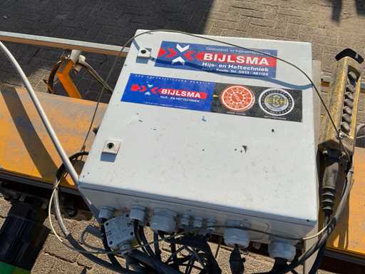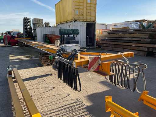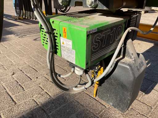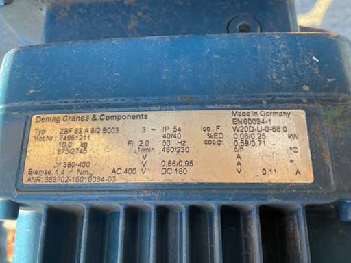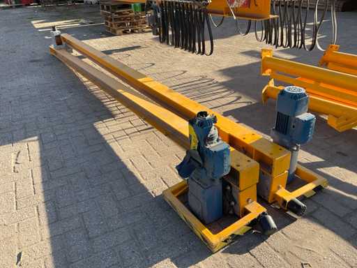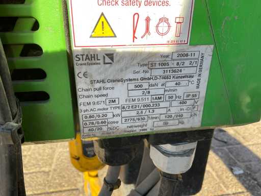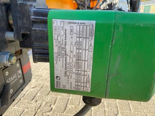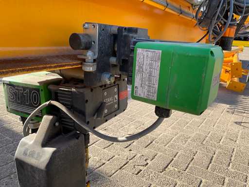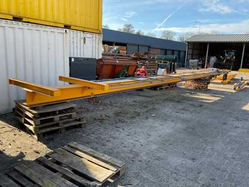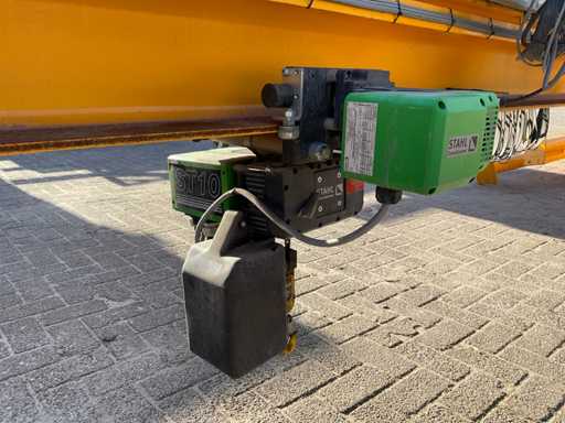 Equipaggiato con: (1x) paranco a catena Stahl, tipo: ST 1005 -8/2, 2008, 400v, carrello KF.10, (1x) telecomando, (1x) guide di alimentazione con avanzamento longitudinale, (4x) gambe inferiori con telaio ad A, altezza circa: 580 cm, (2x) motore di azionamento Demag, tipo: ZBF63, lunghezza trave: 480 cm.