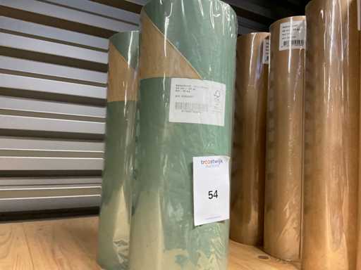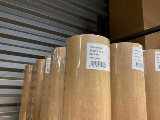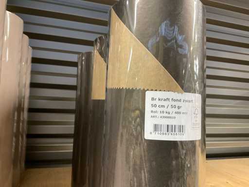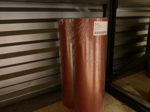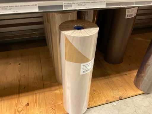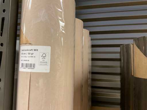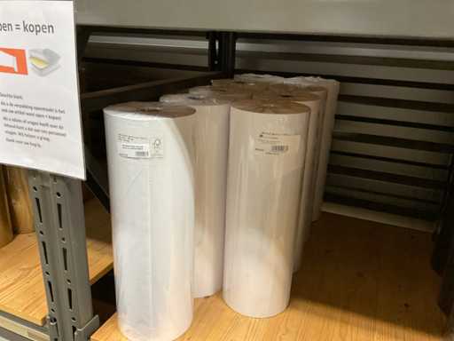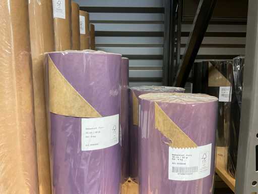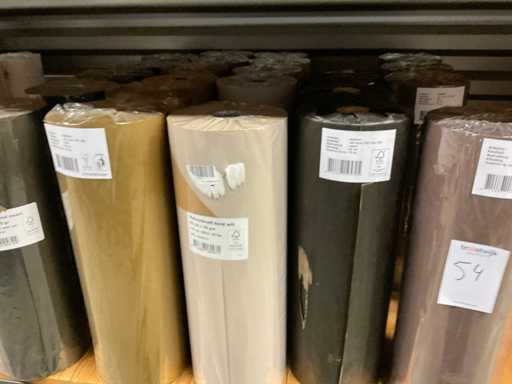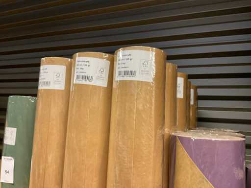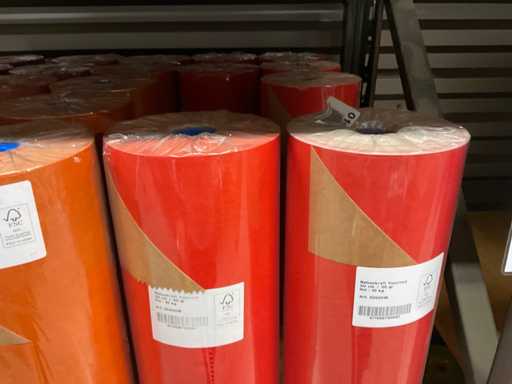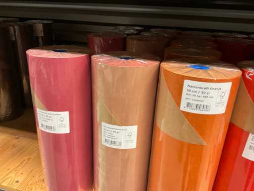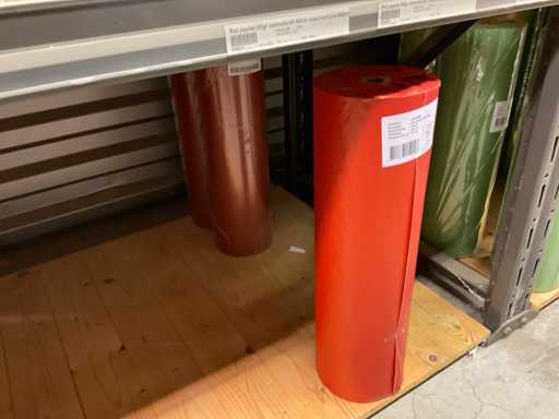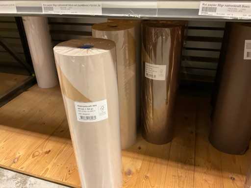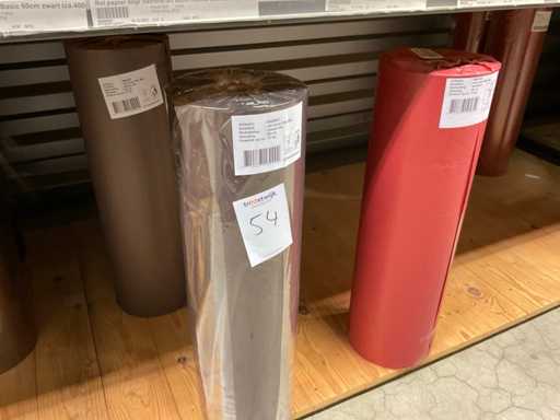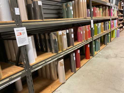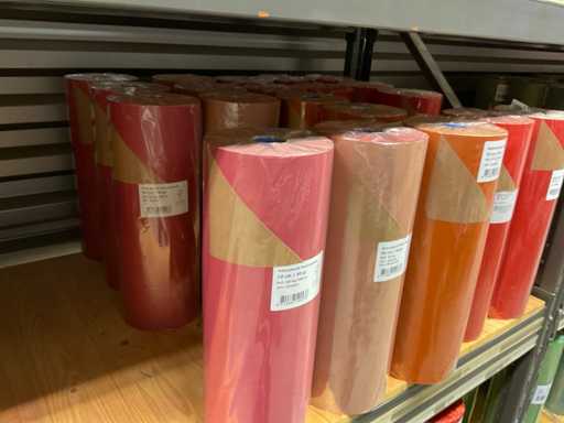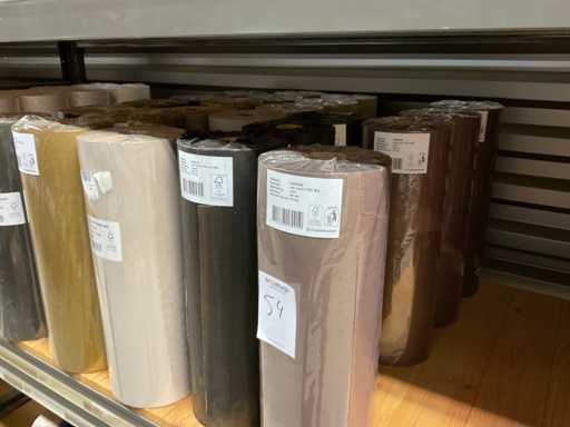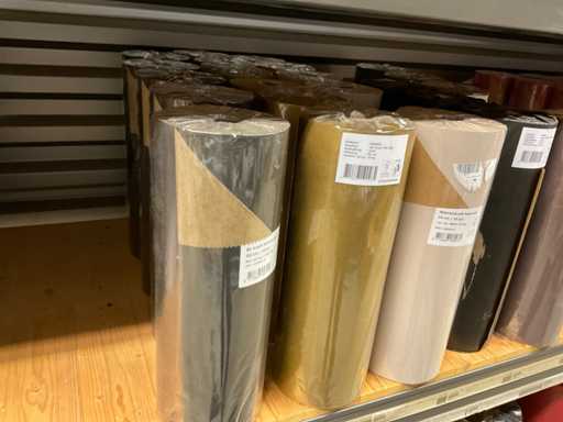 Composto da vari rotoli di varie larghezze, lunghezze e colori, tutti in 3 scomparti di scaffalature uno sopra l'altro.