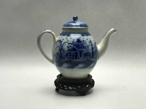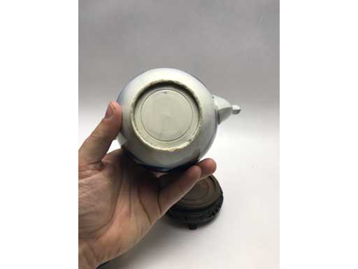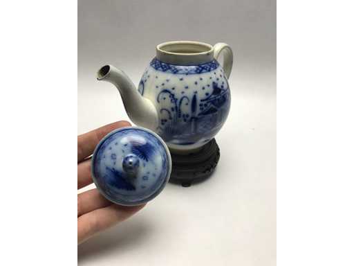 Teiera di ceramica inglese antica circa 1800 dipinta di blu e bianco. Boccale rara in ceramica perla, smaltato dipinto di blu in stile chinoiserie. 18cm.