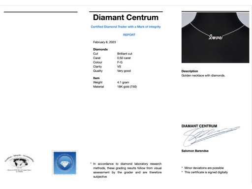 diamanti Diamante: Naturale; Quantità: 52 pezzi; Taglio: Taglio brillante; Peso (carati): 0,50 carati; Colore: F-G; Purezza: USA; Qualità del taglio: Molto buona; Gioiello: Collana; Peso: 4,1 once; Dimensioni/lunghezza: 40 cm; Materiale: oro 18K (750); Condizione: Nuova; Imballaggio: scatola di gioielli di lusso; Spiegazione: La qualità è stata presa dal rapporto relativo all'articolo. La valutazione è una valutazione di un commerciante certificato di diamanti, basata sui prezzi al consumatore; Prezzo al consumo: € 4.673