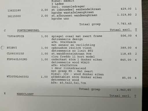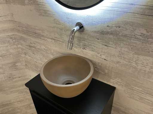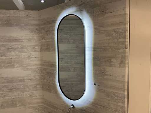 Consiste in uno specchio ovale (90x38x4cm) con sensore e illuminazione, lavabo No Limit 24x13cm, mobile base in rovere scuro 40x20x50cm, fontana a parete con parte montata in superficie 9cm senza parte integrata.
