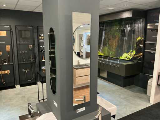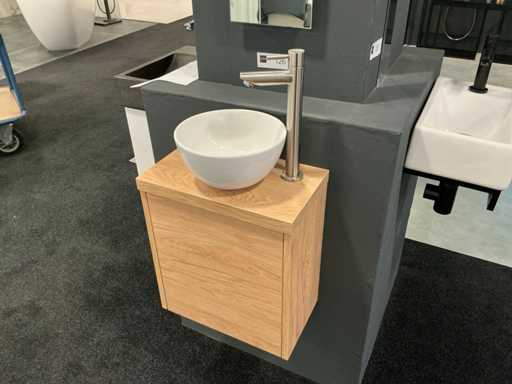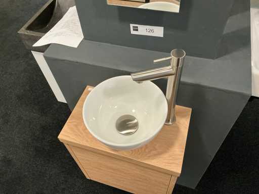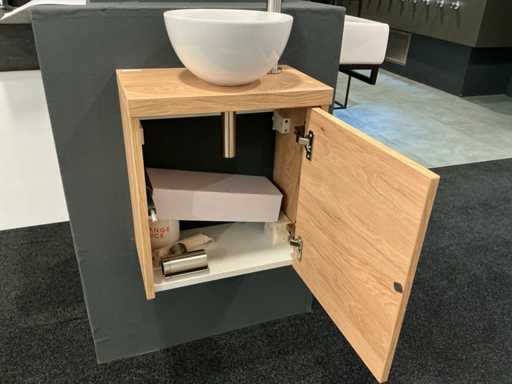 Consiste in uno specchio di 20x90cm, ciotola superiore rotonda da 24cm con parte integrata con fonte di rivestimento integrato senza parte integrata, mobile base Ideal Oak con foglia di copertura (40x23x40cm) con 1 porta a spinta per aperre.