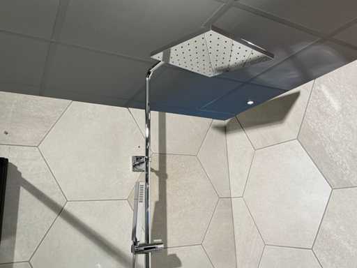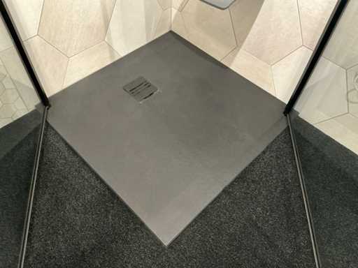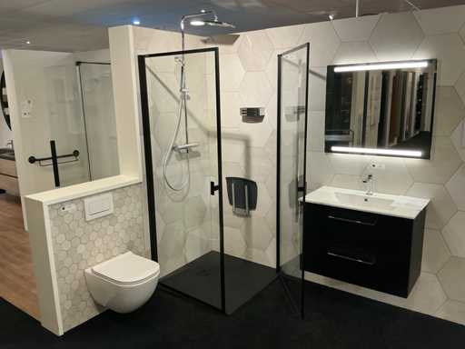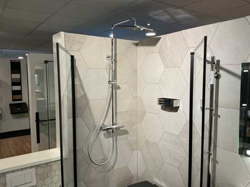 Composto da pavimento doccia Radaway Kyntos (90x90x3cm), 2 parti d'ingresso angolare (L+R) di 90x200cm con vetro trasparente da 8mm, parte incorporata del set doccia antipioggia Christina Omega senza parte incorporata, sedia da doccia pieghevole.