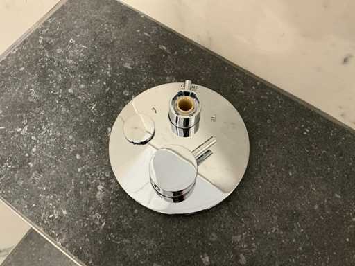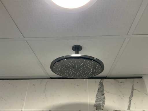 Composto da una doccia a casa a casa Radaway Modo X (100x200cm) con vetro trasparente da 10mm e asta stabilizzante nera da 150cm, accessori per docce Grohe Graphite inclusi componenti integrati come doccia pioggia, doccia a mano, termostato (senza parti integrate)
