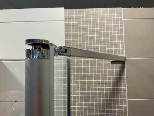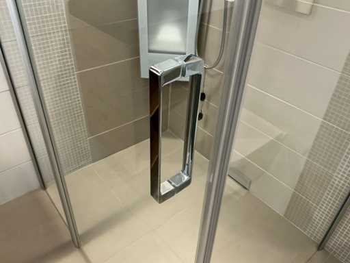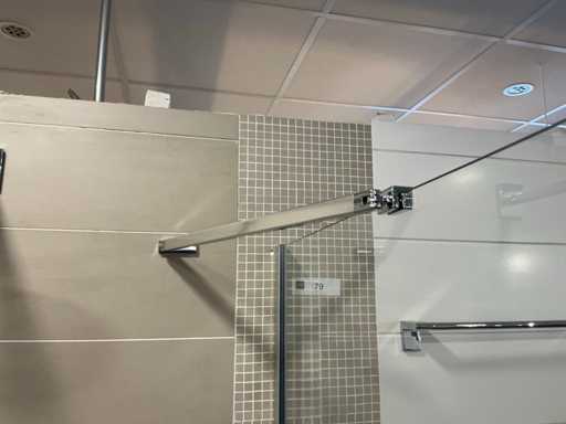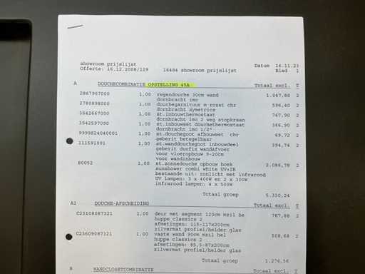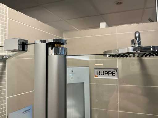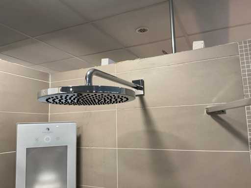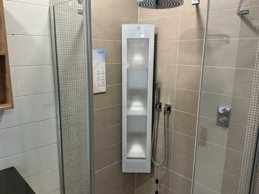 Consiste in un Sunshower combi UV+Infrarossi bianchi, termostato e set doccia antipioggia Dornbracht integrati, pareti e porta Huppe per la doccia.