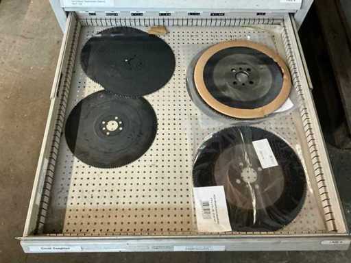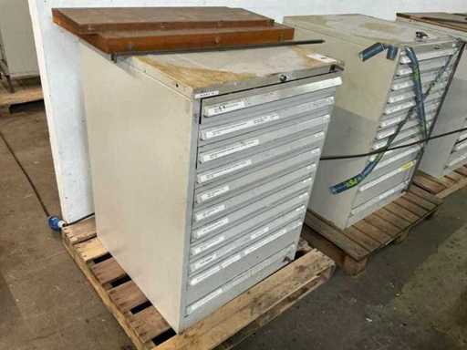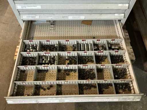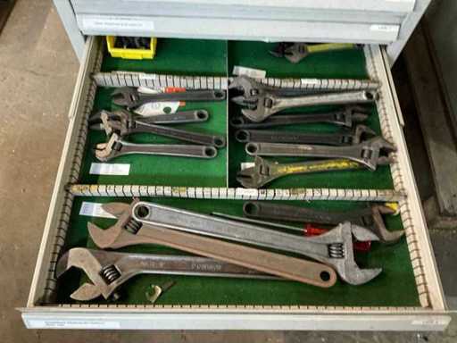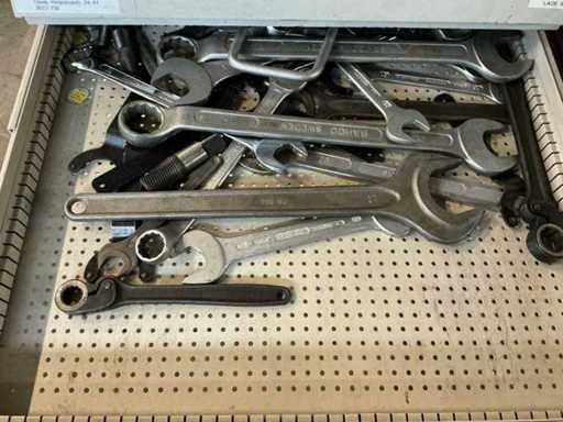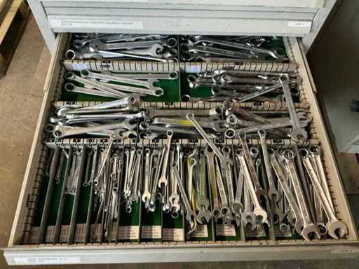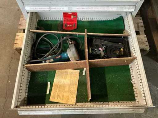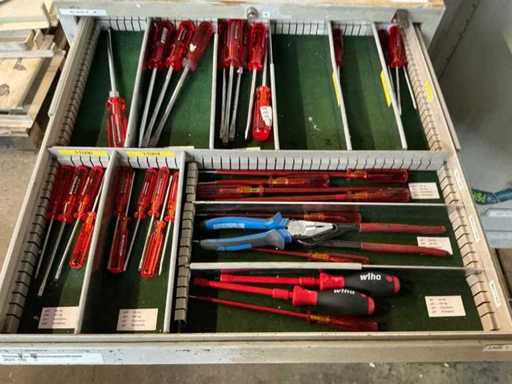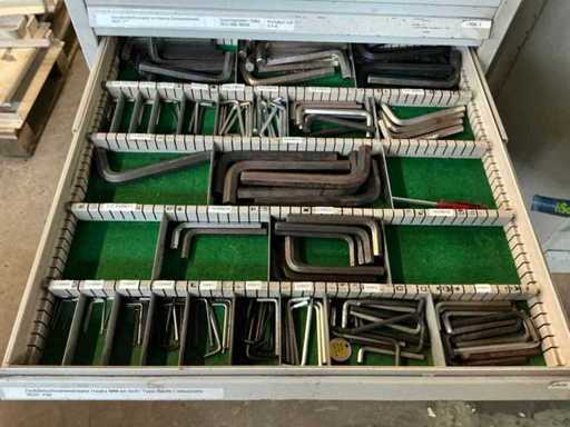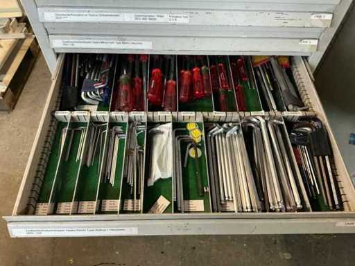 Comò con contenuti, tra cui: cacciaviti, chiavi a Allen, chiavi ad anello / chiavi aperte.