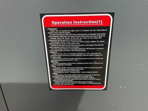 Equipaggiato con potenza motore: 10 HP (7,5 kW); Alimentazione elettrica: 400 V; Frequenza: 50 Hz; Tipo di motore: motore elettrico trifase; Pressione di lavoro: 10 bar; Capacità Aria (FAD): 0,95 m³/min (≈ 950 L/min); Dimensioni: 80 × 60 × 97,5 cm; Peso: 120 kg