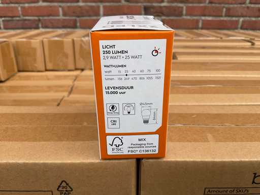 La sorgente luminosa a LED in confezione da 2 con attacco E27 ha una potenza di 2,9 watt per lampada e funziona con una tensione di 220-240 volt. Le lampade emettono una luce bianca calda con una temperatura di colore di 2700 Kelvin e un'emissione luminosa di 250 lumen per lampada. Le sorgenti luminose hanno classe energetica F e sono adatte per apparecchi con attacco E27.