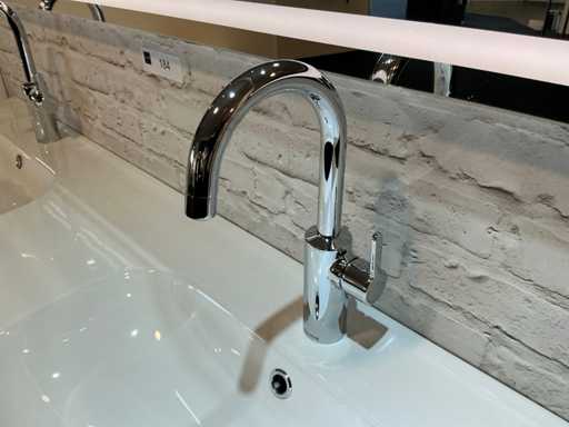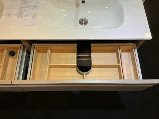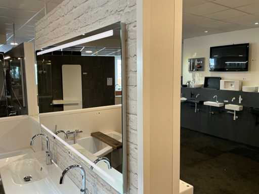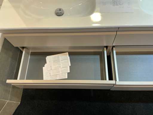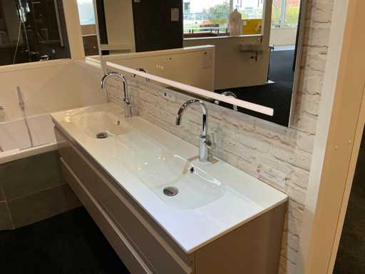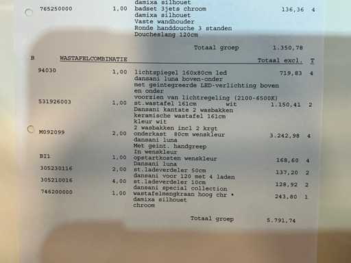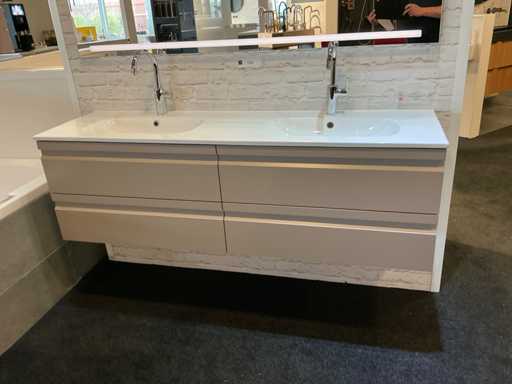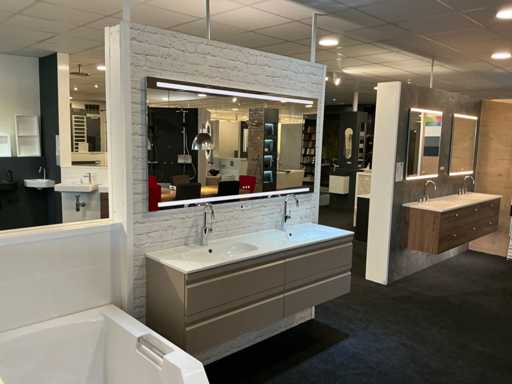 Consiste in uno specchio luminoso (160x80cm), un doppio lavabo per la borraccia da 161cm, 2 armadietti base (80x45x48cm) con 2 cassetti, 2 mixer per lavabo in Damixa Silhouet.
