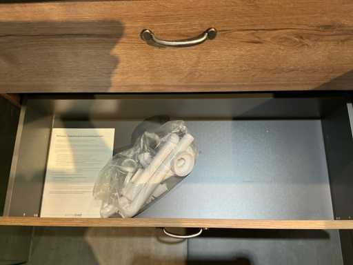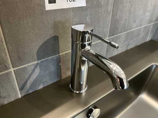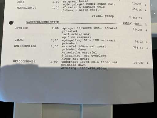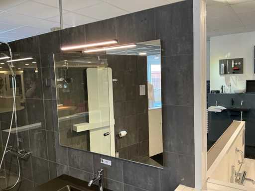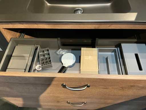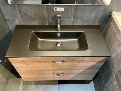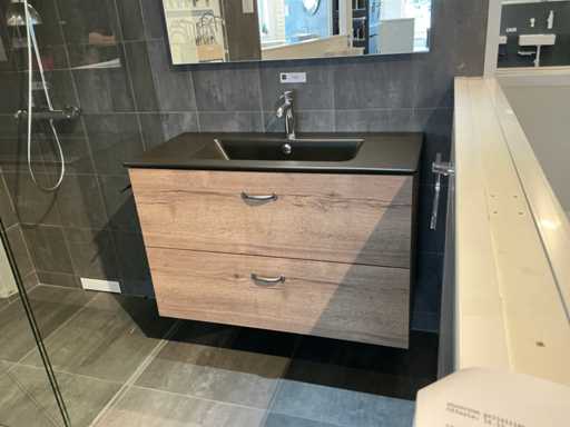 Consiste in uno specchio (100x80cm) su telaio da 5mm con lampada a specchio da 52cm, lavandino in ceramica da 100cm con scambio di sguardo, mobile base in Tabac Oak (100x45x65cm) con 2 cassetti, rubinetto miscelatore Grohe Essence.