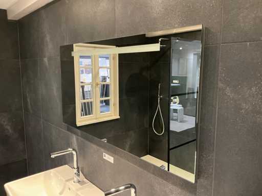Composto da un lavandino Duo 120x47cm con mobile base (colore Kansas Oak) 118x51,4x45,2cm, 2x rubinetto Cristina per lavabo Prime cromato, Villeroy & Boch More to See Mirror 120x60x3cm.