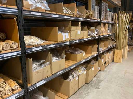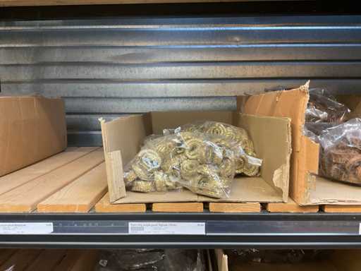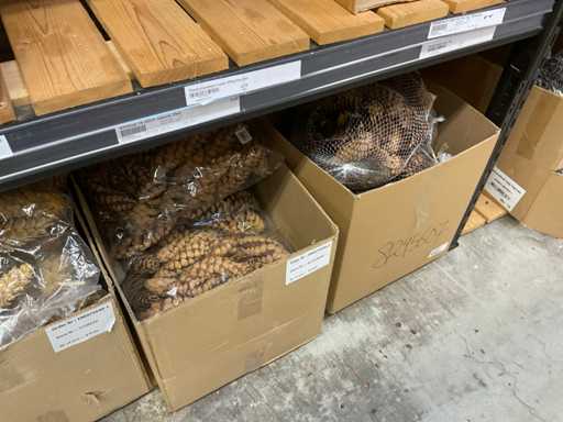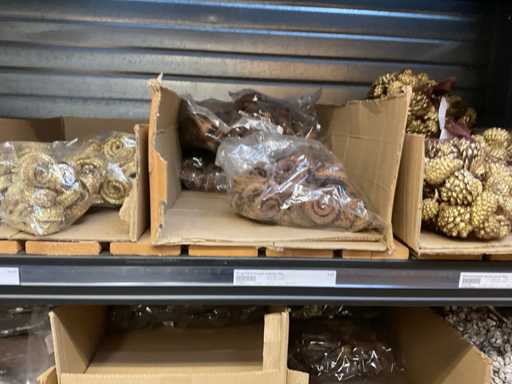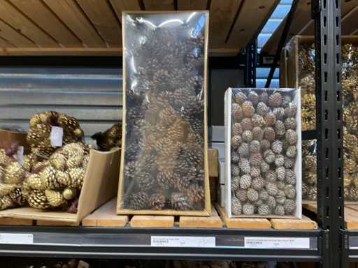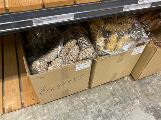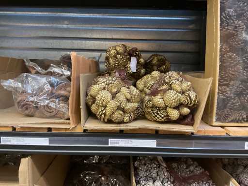 Contenuto di 5 ripiani e cremagliera con cestelli in filo metallico, costituito da pigne e altri materiali decorativi, compreso il rack con cestelli in filo metallico, escluso il rack.