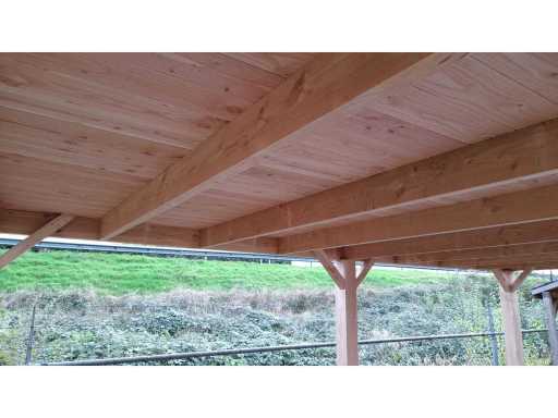 Pali: 150x150 mm Travi: 50x150 mm Tavole del tetto: 18 mm Parte della fascia: 20x200 mm Il tettuccio viene consegnato in un kit, tagliato a misura con le istruzioni di montaggio. Senza portapali e copertura. Confezione: 300x120x80 cm, 450 kg