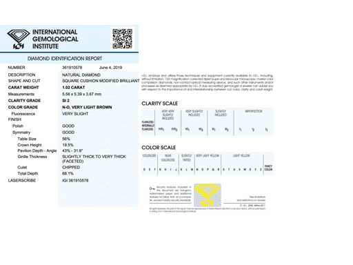 Diamante: Naturale; Quantità: 1 pezzo; Taglio: Taglio a cuscino; Peso (carati): 1,02 carati; Colore: marrone molto chiaro; Purezza: SI2; Qualità del taglio: Buona; Certificato: IGI; Numero certificato: 361910578; Condizione: Nuova; Imballaggio: Scatola delle Gemme; Spiegazione: La qualità è stata presa dal rapporto relativo all'articolo. La valutazione è una valutazione di un commerciante certificato di diamanti, basata sui prezzi al consumatore; Prezzo al consumo: € 7.920