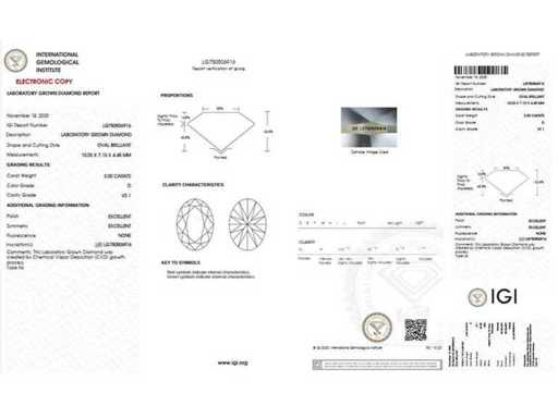Questo diamante coltivato in laboratorio è dotato di un certificato ufficiale IGI e di un rapporto che garantisce la qualità del diamante. Consulta il certificato mostrato nelle foto o consulta la tabella sopra per le specifiche dettagliate dei diamanti. Tutte le caratteristiche menzionate sono state tratte direttamente dal rapporto IGI allegato.