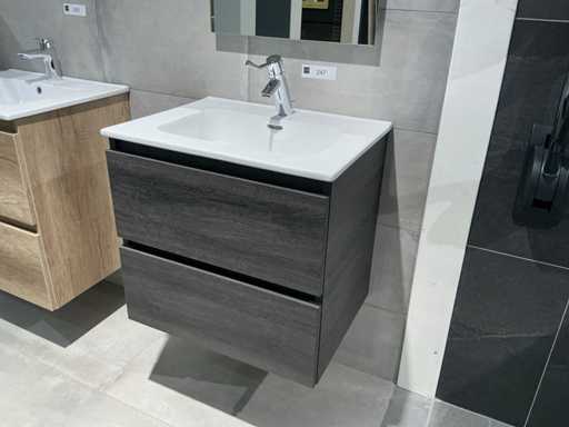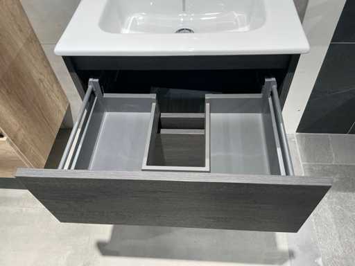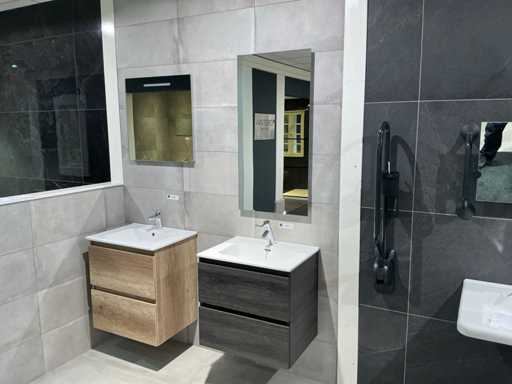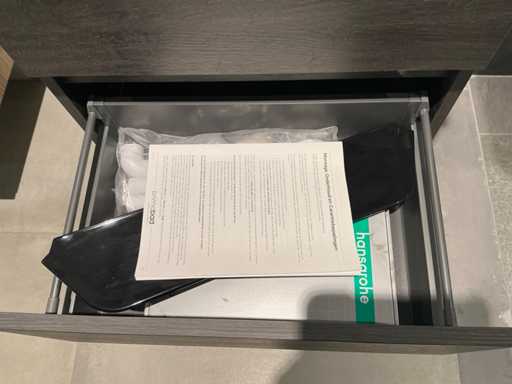Consiste nel lavandino Primabad Terza Edizione 60cm, specchio Primabad con interruttore 50x100cm, tavolo a base Primabad terza edizione in quercia antracite 60cm, miscelatore Hansgröhe a leva singola Focus 70 Care.
