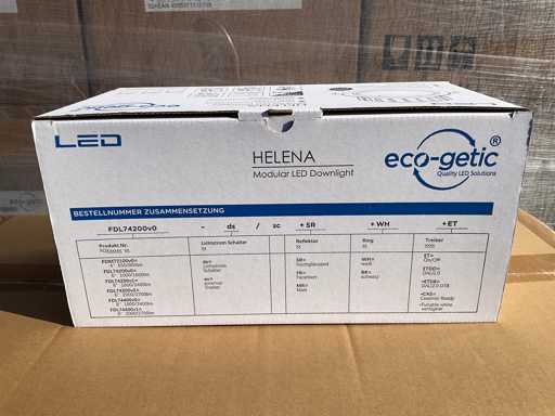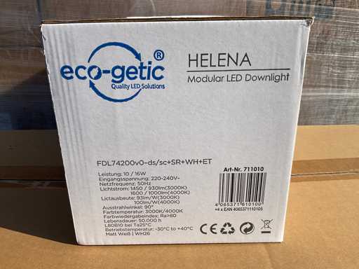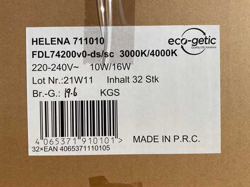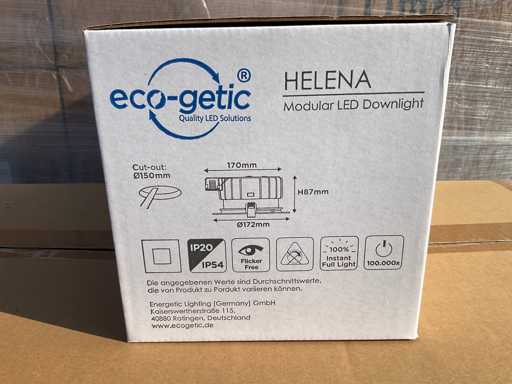 L'Eco-Getic Helena è un downlight LED modulare, sviluppato per un'illuminazione flessibile. Potenza: commutabile tra 10W e 16W. Potenza luminosa: 930-1450 lumen (3000K) / 1000-1600 lumen (4000K). Colore della luce: commutabile tra bianco caldo (3000K) e bianco neutro (4000K). Angolo del fascio: 90° per un'illuminazione ampia e uniforme. Resa cromatica: Ra >80, resa cromatica realistica. Alloggiamento: alluminio con coperchio in plastica. Dimensioni di installazione (foratura): Ø150 mm. Dimensioni: Ø172 mm x H87 mm. Classe di protezione: IP20/IP54 (adatto per spazi interni, resistente agli spruzzi d'acqua nella parte anteriore). Facile installazione con loop-through (cablaggio in-out). Si prega di notare che questo lotto ha uno stock totale di 480 sorgenti luminose. Questi sono divisi in 15 scatole da 32 pezzi.