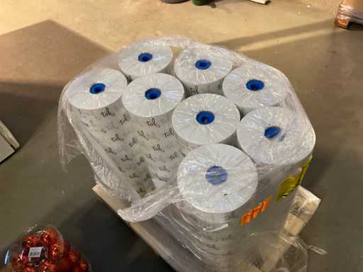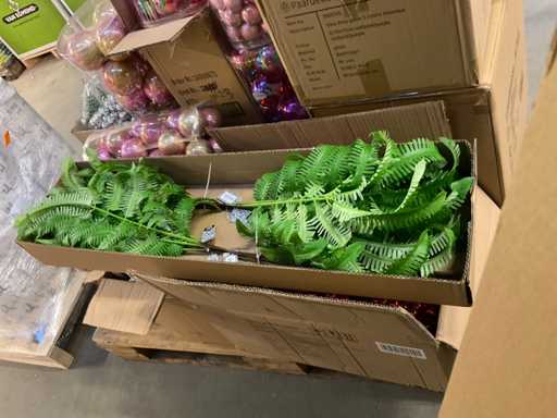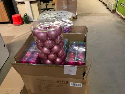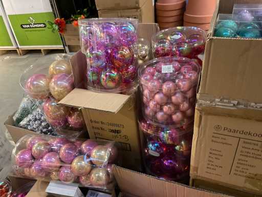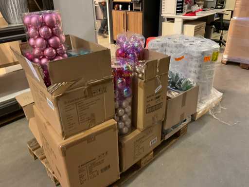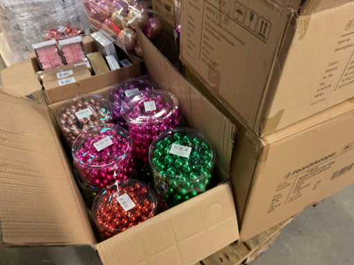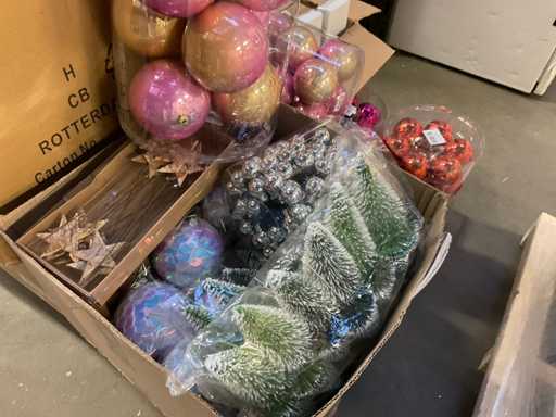 Contenuto su pallet composto da palline di Natale e carta stagnola, compresi i pallet.