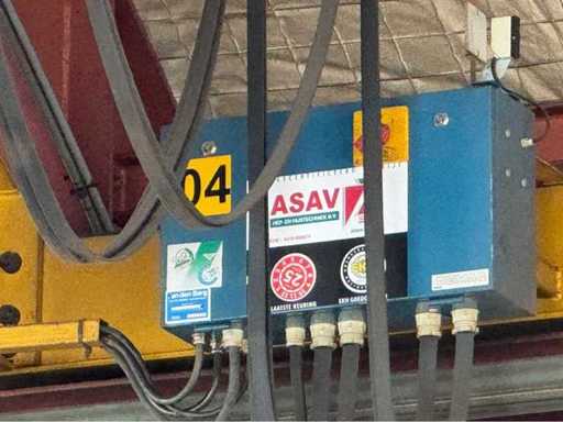 Gru aerea offerta con travi di marcia HEA; con scatola di controllo e telecomando; viene smontata e preparata per il trasporto dal venditore; giorno di visione e ritiro su appuntamento; Riprendere in consultazione; Marzo; aprile 2026; La giornata di visione e take-away si tiene a Groot-Ammers