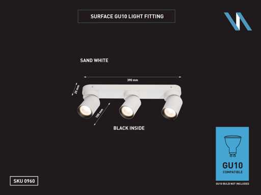 sigillatura IP20, colore del prodotto bianco e nero, tenue. Ø 60 x 100mm, dimensioni portaparete 390 x 60 x 25mm, rotabile 350° e inclinabile 50°, materiale alluminio e ferro, montaggio incluso, montaggio GU10, lampadina non inclusa, adatto all'interno, ingresso 3 lampadine, tensione 220-240V, massimo 40 watt, SKU 00960