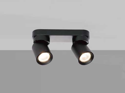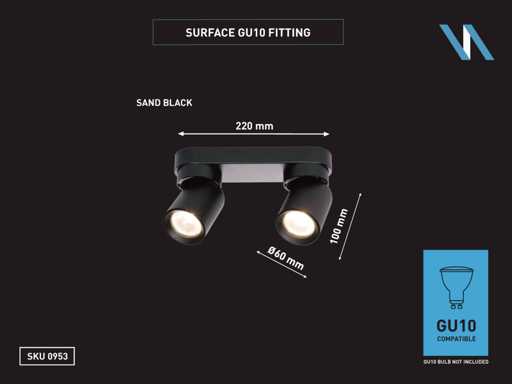 sigillamento IP20, colore del prodotto nero sabbia, fioco. Ø 60 x 100mm, dimensioni portalampade 220 x 60 x 25mm, rotabile 350° e inclinabile 50°, materiale alluminio e ferro, montaggio incluso, installazione GU10, lampadina non inclusa, adatto all'interno, 2 x ingresso lampadina, tensione 220-240V, massimo 40 watt, numero di numero 00953