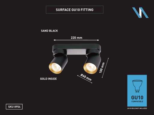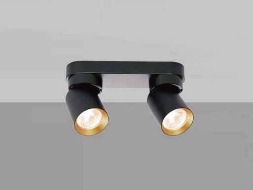 sigillamento IP20, colore del prodotto anello nero e oro, tenue. Ø 60 x 100mm, dimensioni portalampade 220 x 60 x 25mm, ruotabile 350° e inclinabile 50°, materiale alluminio e ferro, montaggio incluso, montaggio GU10, lampadina non inclusa, adatto all'interno, 2 x ingresso lampadina, tensione 220-240V, massimo 40 watt, SKU 00954